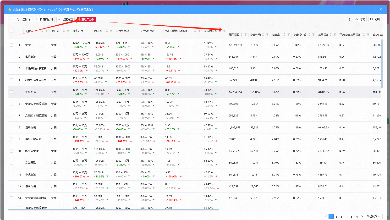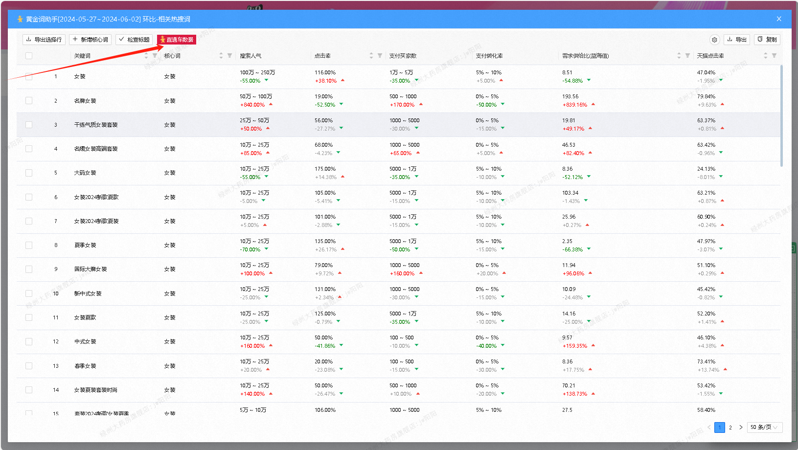 6:数据加载完毕后,根据自己需求是否需要付费词的相关数据,可点击弹出框左上角直通车数据的按钮